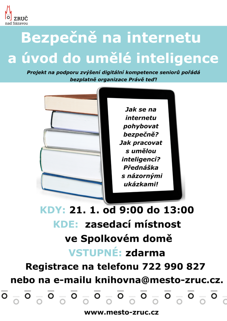OKŠS vás zve na přednášku Bezpečně na internetu a úvod do umělé inteligence, kterou pro seniory bezplatně pořádá organizace Právě teď! Přednáška se bude konat 21. 1. od 9:00 do 13:00 v zasedací místnosti SD. Registrace na telefonu 722 990 827 nebo na emailu knihovna@mesto-zruc.cz.