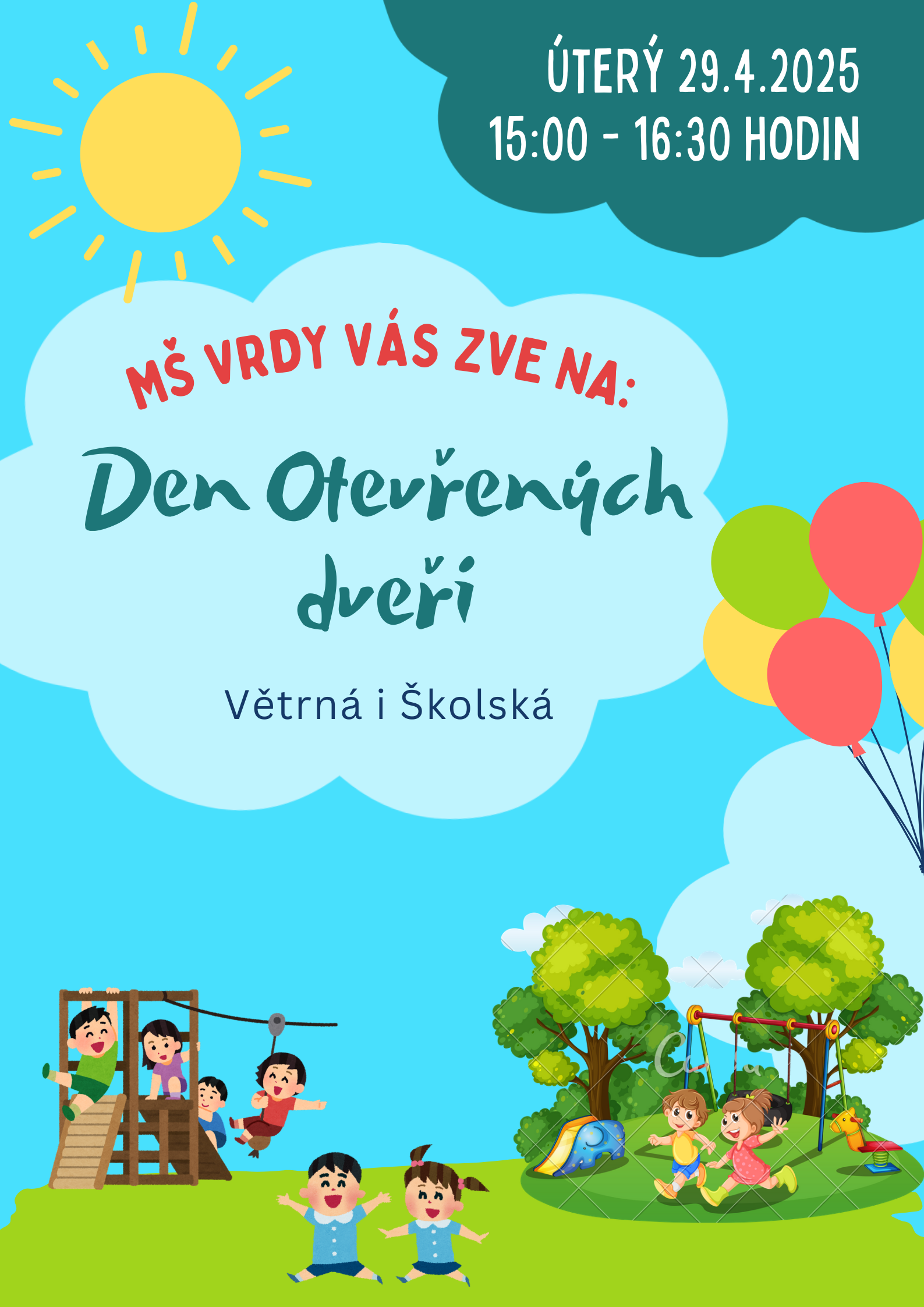 Zveme vás na Den Otevřených dveří, který se koná 29. dubna 2025 od 15:00 do 16:30 hod. MŠ Větrná a Školská. Přijďte se podívat na naše prostory a poznat nás blíže!