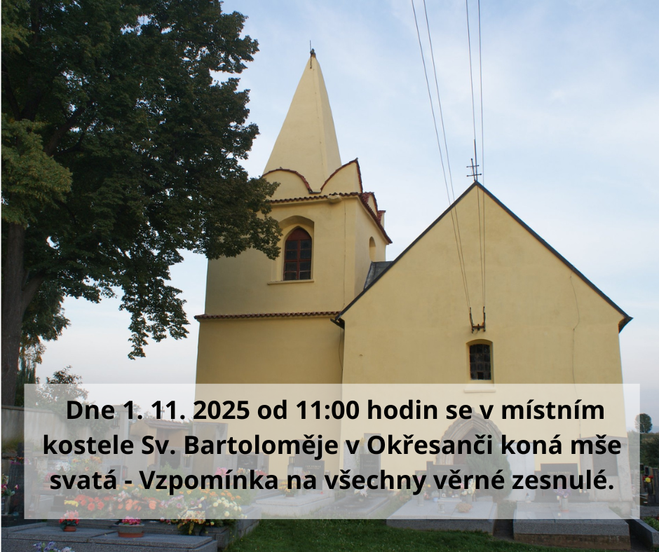 Dne 1. 11. 2025 od 11:00 hodin se v místním kostele Sv. Bartoloměje v Okřesanči koná mše svatá - Vzpomínka na všechny věrné zesnulé.