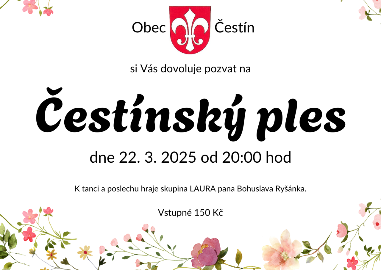 Obec Cestín si vás dovoluje pozvat na Čestinský ples. K tanci a poslechu hraje skupina LAURA pana Bohuslava Ryšánka. Vstupné činí 150 Kč.
