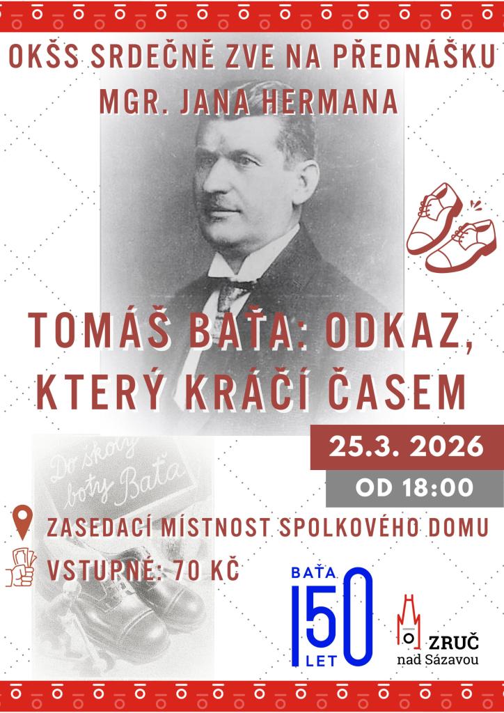 OKŠS vás srdečně zve na přednášku Mgr. Jana Hermana o Tomáši Baťovi, která se bude konat 25. 3. 2026 od 18:00 v zasedací místnosti ve Spolkovém domě. Vstupné 70 Kč. Těšíme se na vás.
