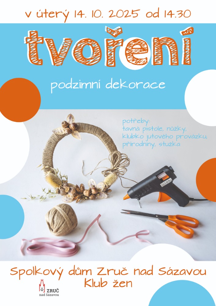 Klub žen pořádá v úterý 14. 10. od 14:30 ve své klubovně tvoření. Vyrábět se budou podzimní dekorace. S sebou si vezměte tavnou pistoli, nůžky, klubko jutového provázku, přírodniny a stužku. Těšíme se na vás.