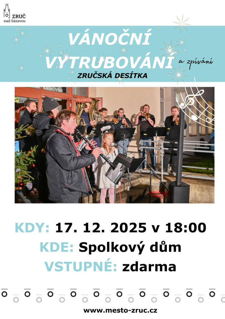 OKŠS a Zručská desítka vás srdečně zvou na již tradiční VÁNOČNÍ VYTRUBOVÁNÍ, které se bude konat 17. 12. od 18:00 před Spolkovým domem. Přijďte si užít sváteční atmosféru. Těšíme se na vás.