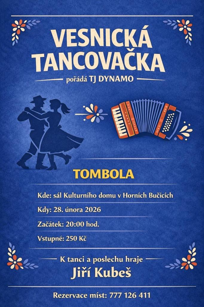 TJ Dynamo Horní Bučice pořádá Vesnickou tancovačku v Horních Bučících dne 28.2.2026 od 20:00 hod.